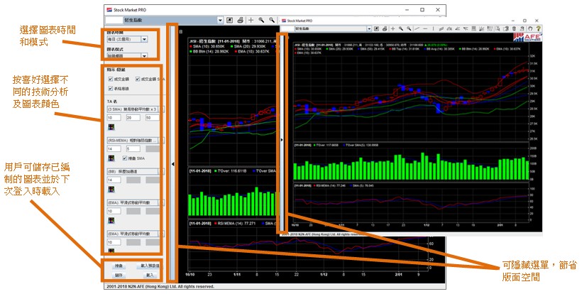 3. 圖表列表 全新的圖表介面將所有技術分析工具按類別分成多個選單,選單會在介面左方整齊列出,用戶可按照不同需要自訂合適圖表,完成後亦可選擇隱藏功能表,節省版面空間。用戶還可儲存已編制的圖表,於下次登入時只需載入圖表便可,省時又方便。