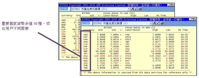 SMP股市寶8.2.2新功能 1. 外匯/貴金屬報價 N2N-AFE所提供的外匯數量將由現時12種大幅增至30種 (837600-03),其中包括各熱門旅遊國家之貨幣匯率、在岸及離岸人民幣和其他重要貨幣之美元及港元兌換價。