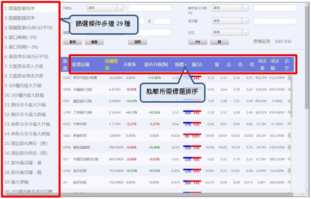 2. 異動掃瞄器 N2N-AFE所創的異動掃瞄器配備多達29種篩選條件,例如競價盤量排序、裂口高開、大盤資金流入力度等條件,幫你找出短線最具倍升潛力的股票。