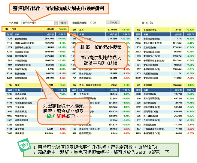 3. 熱門行業 在波動的投資環境,熱炒板塊是投資者最有興趣的資訊之一。用戶可以按成交額或升/ 跌幅排列市場板塊。同時系統會自動列出該板塊十大市值股票,用戶只需一眼便可掌握大戶於各板塊的投資取向,市場焦點一覽無遺。