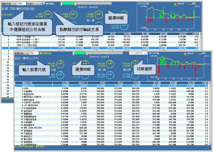 4. 股票/ 經紀分析 分析過去 30 天的市場動態,讓用戶能追蹤香港所有券商的股票交易活動。更提供十大份額三十天走勢圖,讓你掌握A組行的資金走勢,幫助用戶分析價格變動的影響和買賣方向,更有效提高監察不尋常價位的活動情況。