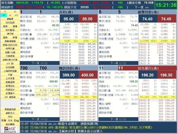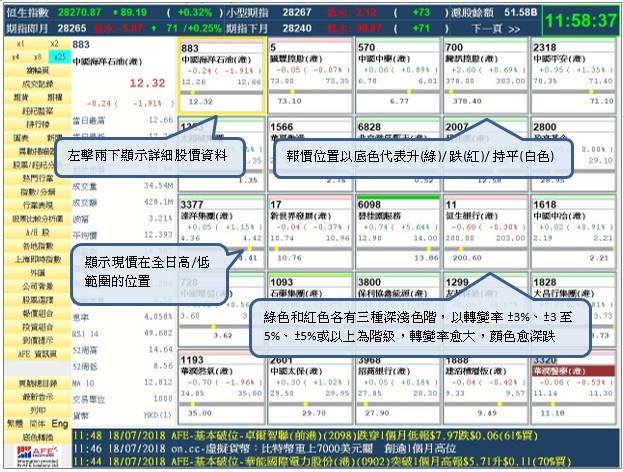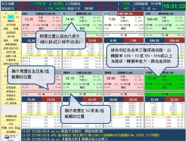 1. 多視窗功能 (4 / 8 / 25格報價畫面) 除了原有個別及綜合畫面外,現新增4 / 8 / 25格報價畫面,用戶可於一個畫面內同時監察多達25個股票報價資訊,掌握股價走勢更勝從前。 當中8格及25格的報價位置更以底色代表升(綠)/ 跌(紅)/ 持平(白色),其中綠色和紅色各有三種深淺色階,以轉變率 ±3%、±3至5%、±5%或以上為階級,轉變率愈大,顏色愈深,升升跌跌自然一目了然。 4 格報價畫面